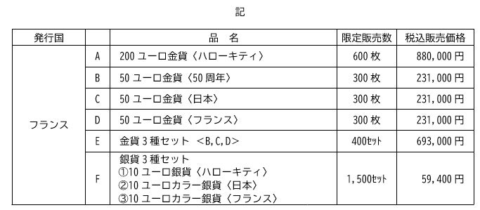 本記念コインは、世界最古の歴史とデザイン性の高いコインなどで定評があるフランス国立造幣局(モネ・ド・パリ)が鋳造し、日本をはじめ世界のハローキティファンに向けて発行されます。50年前の誕生時のデザインをイメージし、正面を向いて、横向きに座ったハローキティの形をした特別な金貨をはじめ、ベレー帽にワンピース姿のハローキティがパリを散歩するデザインや、振袖や和傘など日本らしいモチーフを取り入れ可愛さと気品を感じさせるハローキティを描いたものなど、7種類6商品をラインアップします。