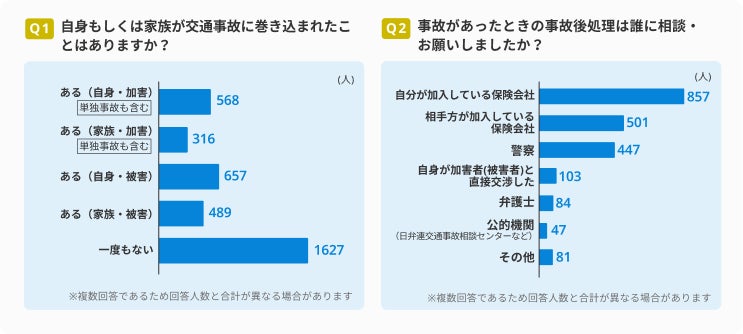 また、交通事故の経験がある方1,373人を対象として、「事故があったときの事故後処理は誰に相談・お願いしましたか?」と質問したところ、「自分が加入している保険会社」と回答した方が857人であり、次点の「相手方が加入している保険会社」と回答した方501人と比較して、非常に多い結果となりました。