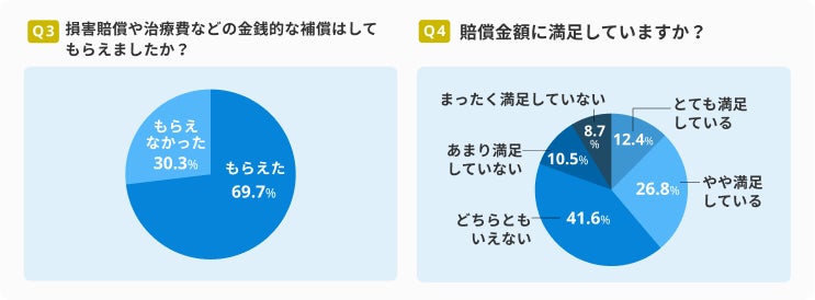 続いて、自身が交通事故の被害者となった経験がある方の内、無作為に選定した300人を対象として「損害賠償や治療費などの金銭的な補償はしてもらえましたか?」と質問したところ、69.7%の方が「もらえた」と回答しました。