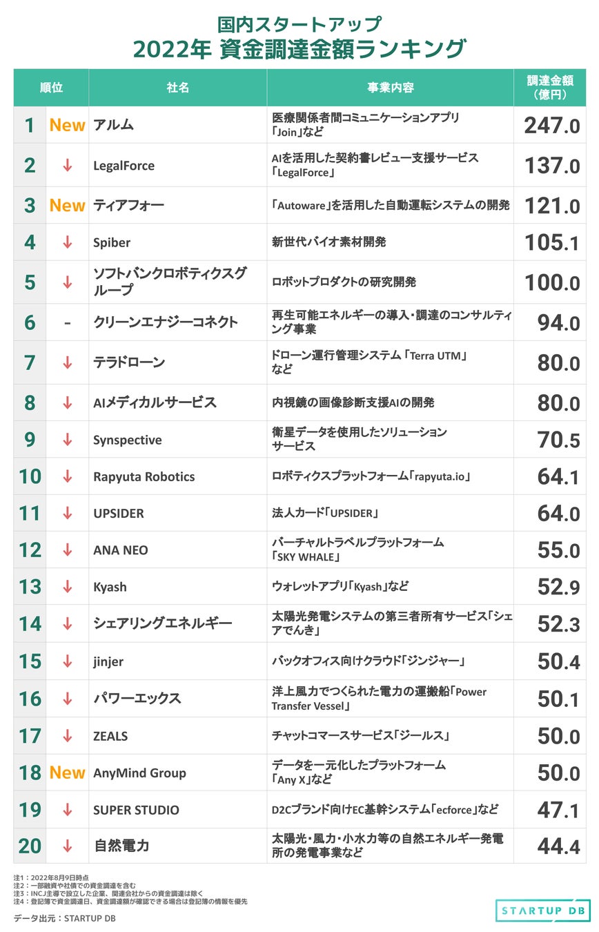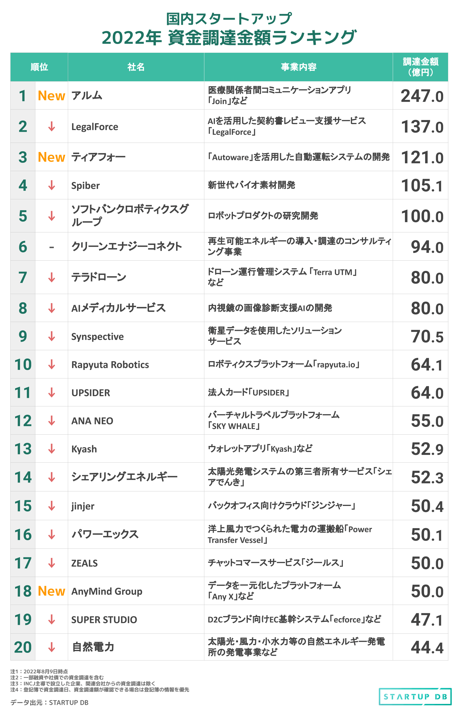 2022年1-7月の国内スタートアップ資金調達金額ランキングにおける新規ランクイン企業は、1位にランクインしたアルムをはじめ、ティアフォー、AnyMind Groupの計3社となりました。