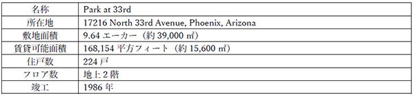 阪急阪神不動産株式会社(本社:大阪市北区、社長:諸冨隆一(※1))では、今般、当社の100%子会社であるアメリカ現地法人“Hankyu Hanshin Properties USA LLC”を通じ、アリゾナ州フェニックス市の賃貸住宅「Park at 33rd」(以下、「本物件」)を取得しました。
