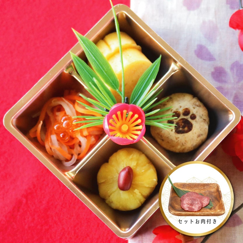 食材には、冬の免疫力維持が期待できるサツマイモや鶏肉、イワシなどを使用し、わんちゃんの健康を第一に考えて作りました。4種類のおせち料理と業態ごとに違ったお肉をセットにした内容になっており、お腹にも嬉しいおせちプレートとなります。