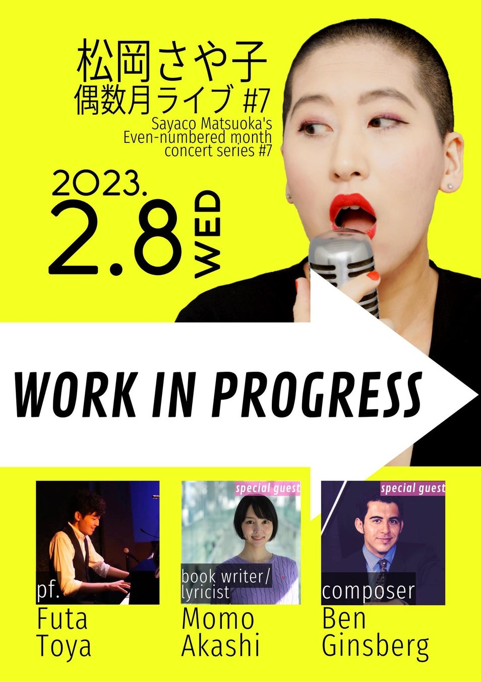 ワークショップの出演者松岡さや子氏のソロライブにおいて、MINORU: Scrape the Skyの曲をコンサート形式で発表いたします。作曲家Ben Ginsbergと作詞脚本家明石ももがゲスト出演いたします。
