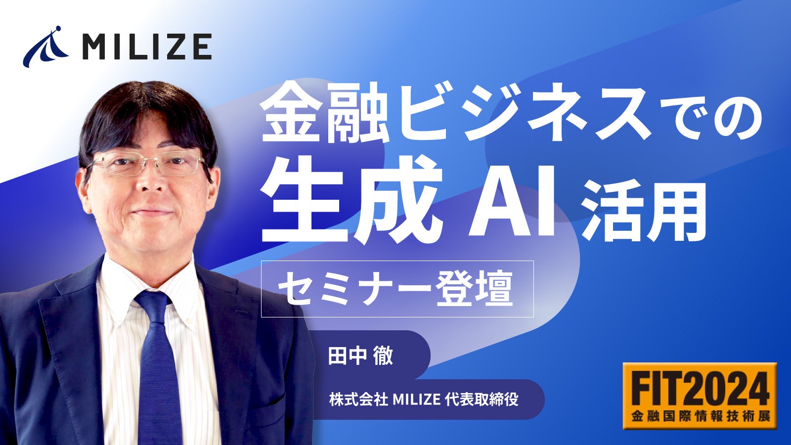 株式会社MILIZE(本社:東京都港区、代表取締役社長:田中 徹、以下「MILIZE」)は、10月17日(木)から18日(金)の2日間、東京国際フォーラムで開催される「FIT2024(金融国際情報技術展)」に出展いたします。