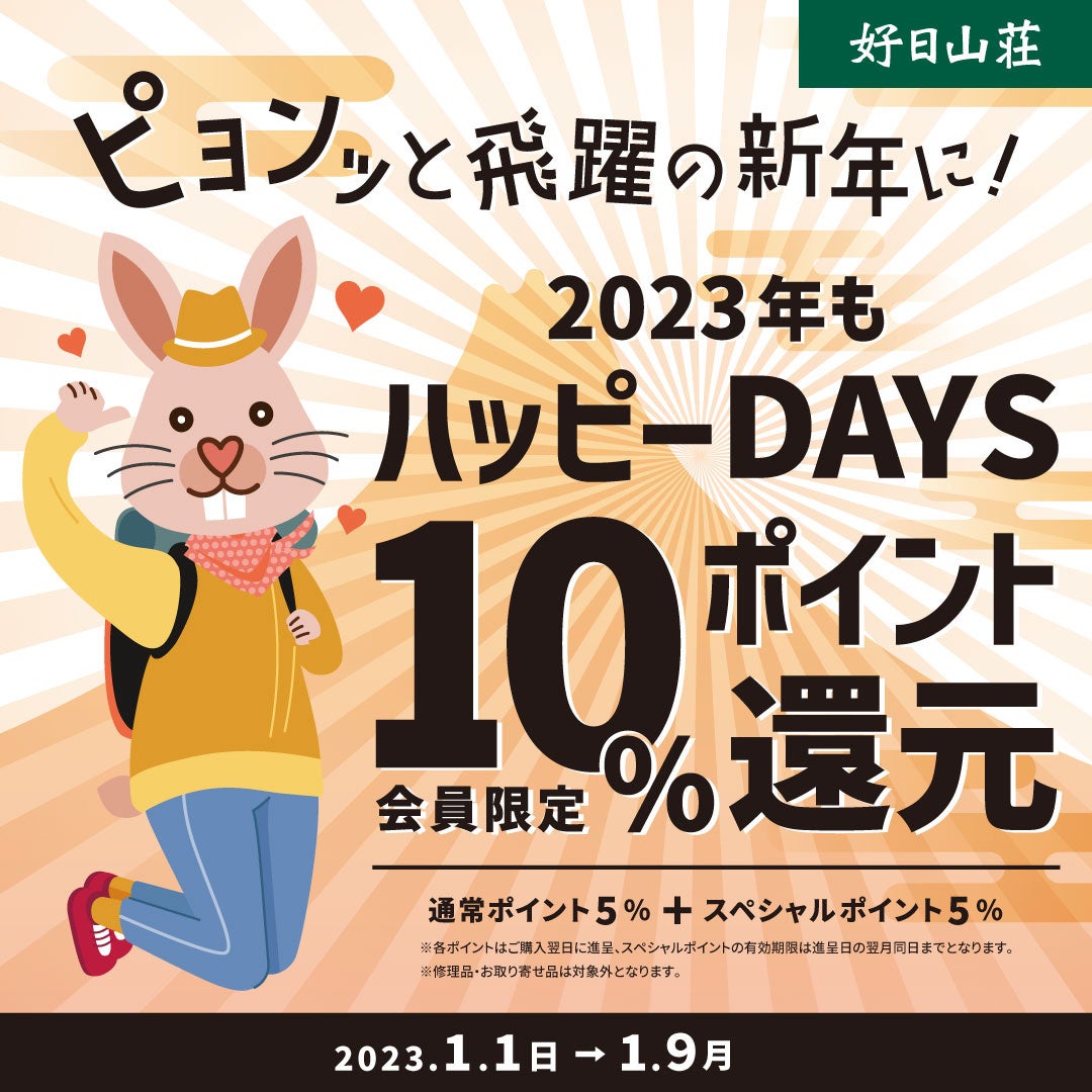 新年明けましておめでとうございます。好日山荘では、初日の出登山や初登りなどへお出掛けの皆さまが、2023年もピョンと飛躍の年となるよう祈願して、メンバーズポイントが10%還元となる「2023年もハッピーDAYS」を開催します。