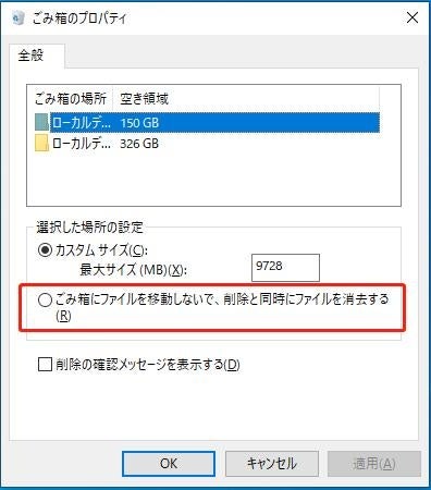 次のように、ごみ箱の設定がされているかを再度確認してみてください。