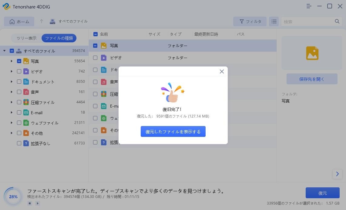 手順4.データの保存場所を指定すると、「ok」をクリックし、しばらくお待ち、「復旧完了」というプロンプトが見えます。