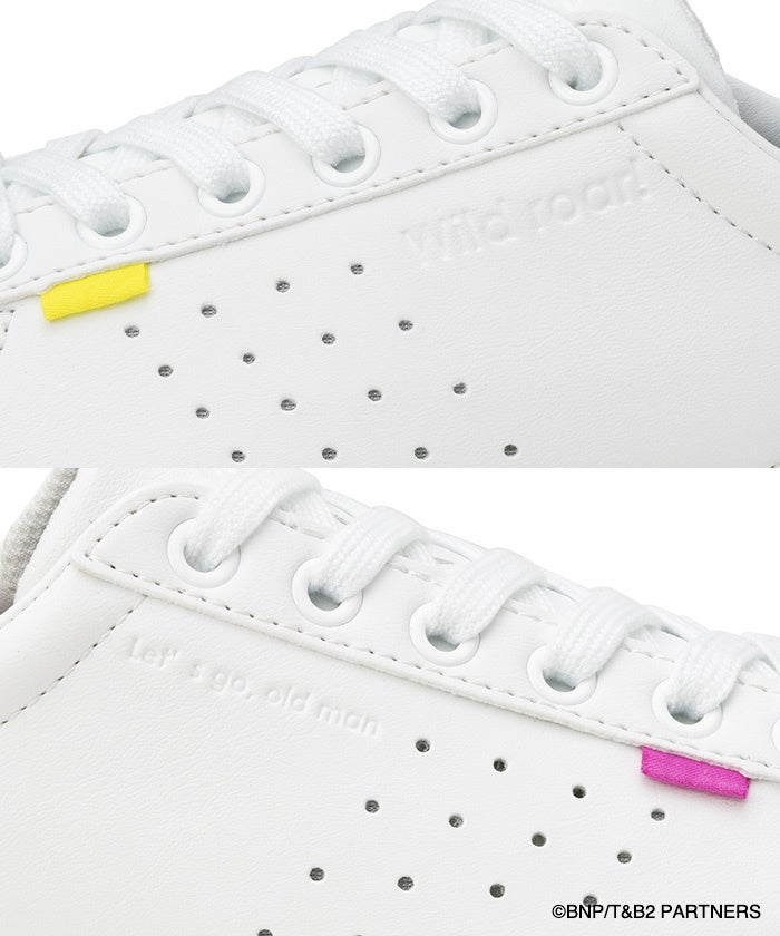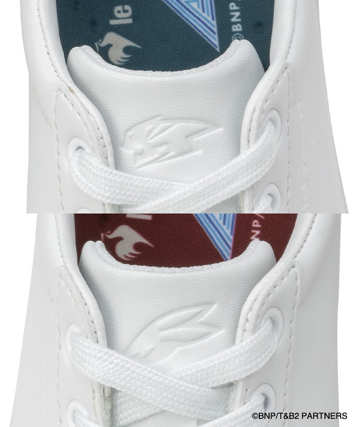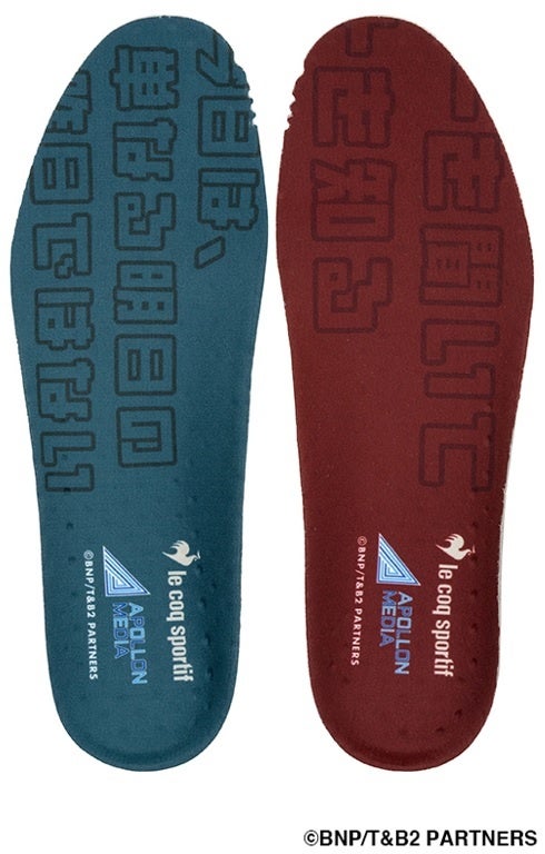 スニーカーは、『ルコックスポルティフ』の軽量性とフィット感にこだわった定番コートスニーカー「ラ ローラン」がベース。左右のシューズにメインキャラクターであるワイルドタイガー(左足)と、バーナビー・ブルックス Jr. (右足)のそれぞれのイメージを盛り込むことで2人の「バディ」感を表現しています。アッパーのサイドにはそれぞれのカラーと決め台詞「ワイルドに吠えるぜ!(Wild roar!)」と「行きますよ、おじさん(Let’s go old man.)」の英訳の型押しを施し、さらにシュータンにも彼らのヒーローマークを型押ししています。「ヒーローの内面」は、インソールの左右をそれぞれのカラーにして表現。また、2人の絆が描かれた回のサブタイトルをプリントすることで、もう一度アニメを見返したくなるようなデザインにしています。さらに、『ルコックスポルティフ』のロゴと、彼らが所属する企業「APOLLON MEDIA」のロゴを入れ、今回のコラボレーション限定のスペシャル感を演出しています。
