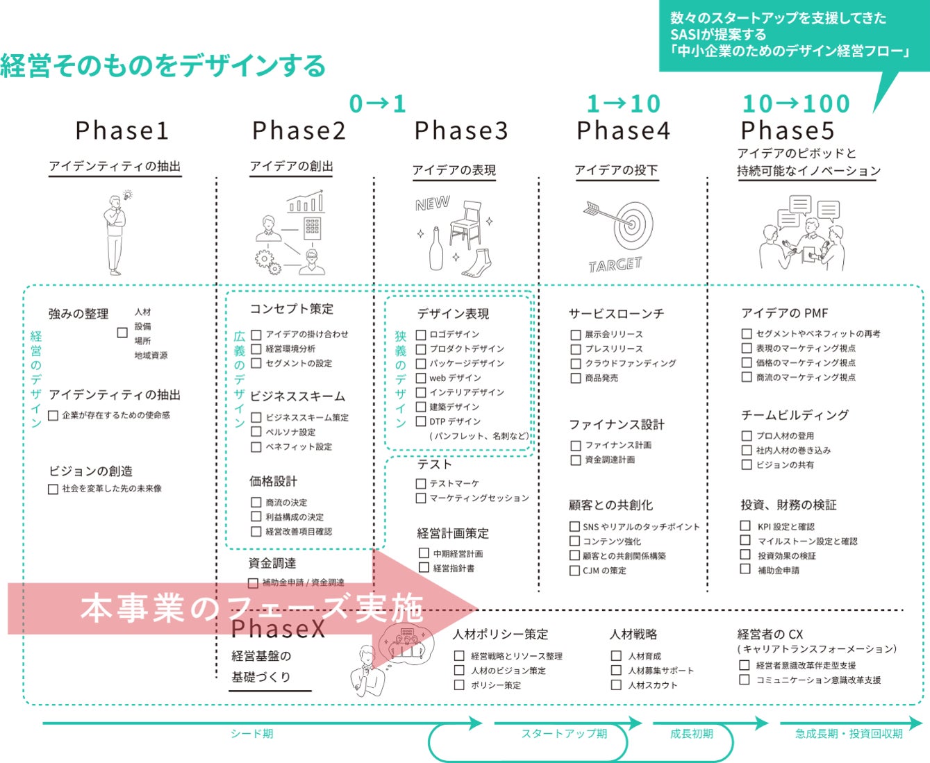 VUCAの時代においては、揺らぐことのない確固たるアイデンティティに基づいた価値を創造することが、経営革新へとつながります。本事業では、この自社にしか生み出せない価値を「経営計画・事業計画」に反映できるよう、アイデンティティ型デザイン経営の専門家が一社ずつ伴走支援を行います。事業者が「フロントランナー」「高付加価値企業」として成長していく過程で好循環を創出し、市内企業の経営革新やイノベーションへの機運を醸成します。