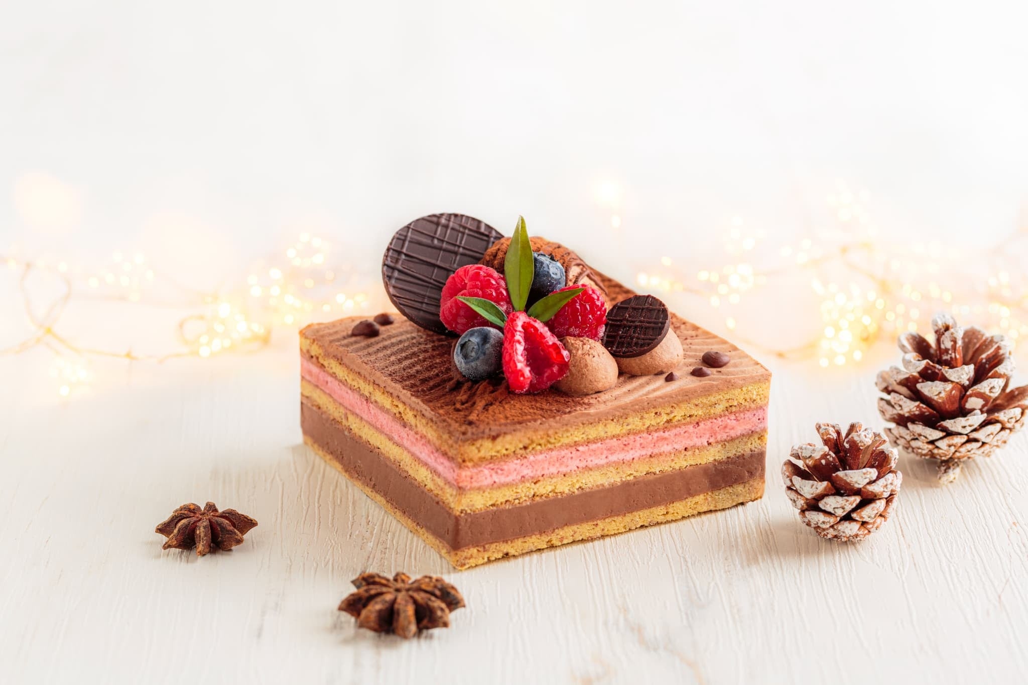 濃厚なチョコカスタードとラズベリームースの程良い酸味の絶妙なバランスを、生クリームとともにご堪能ください。