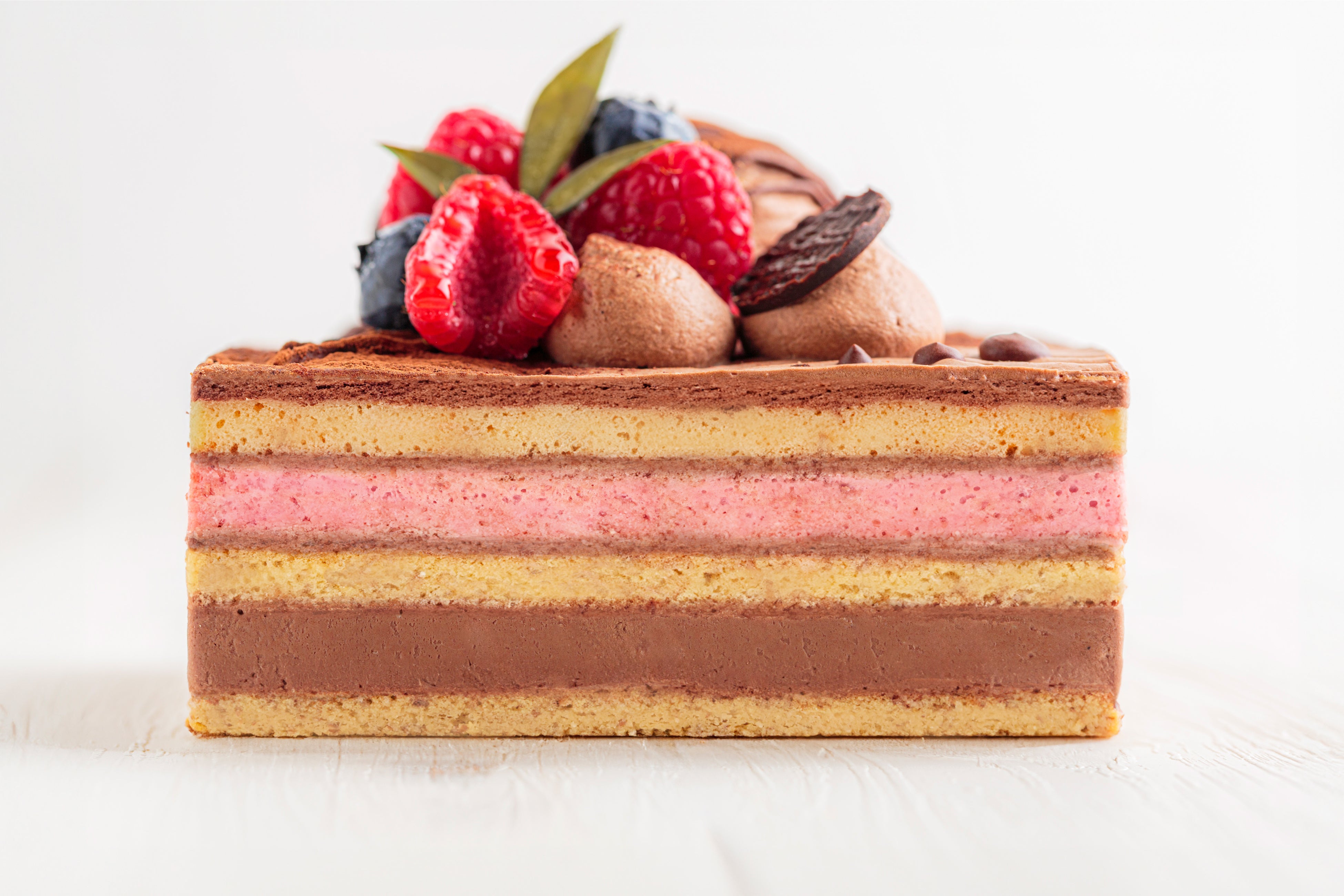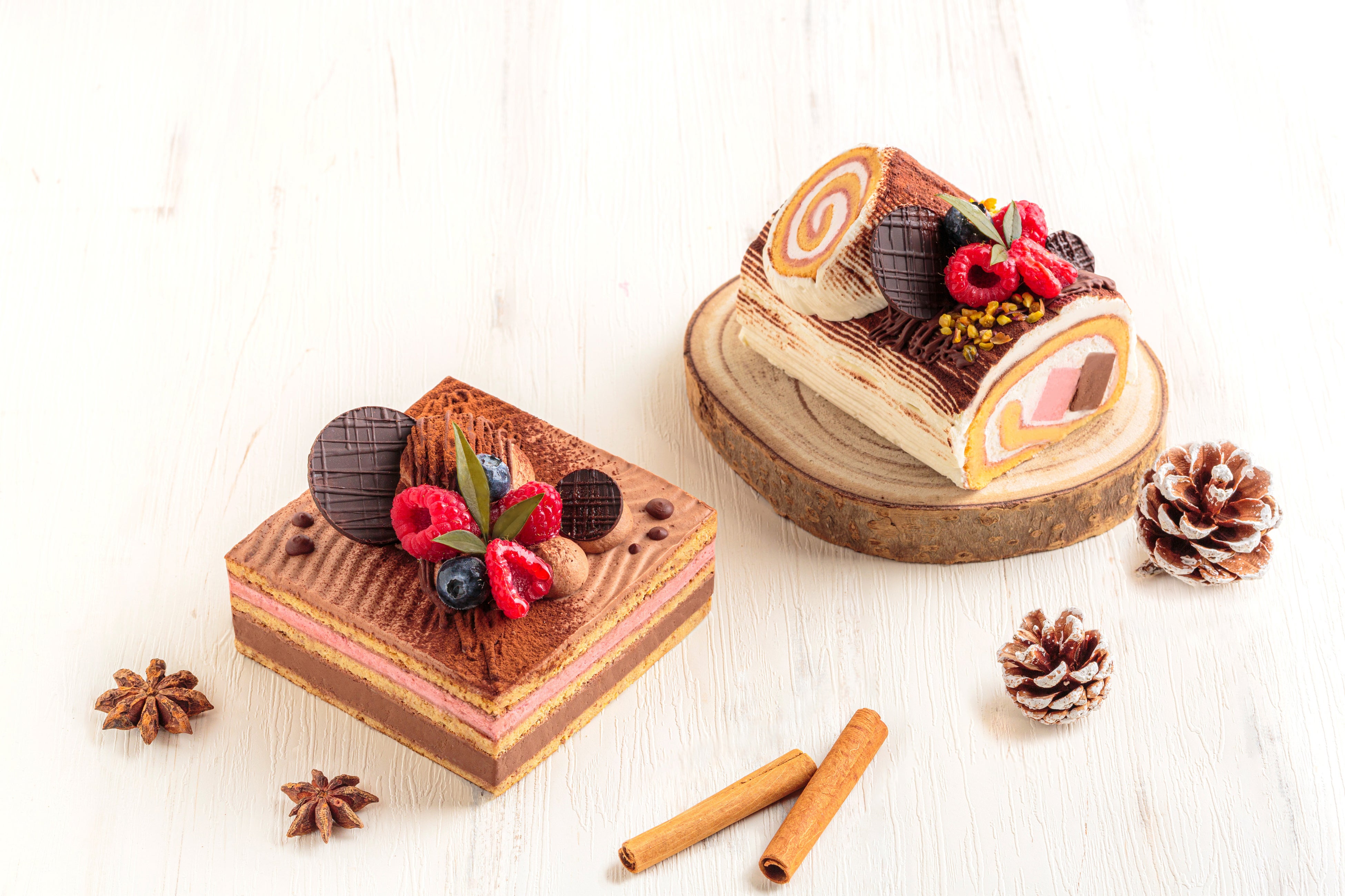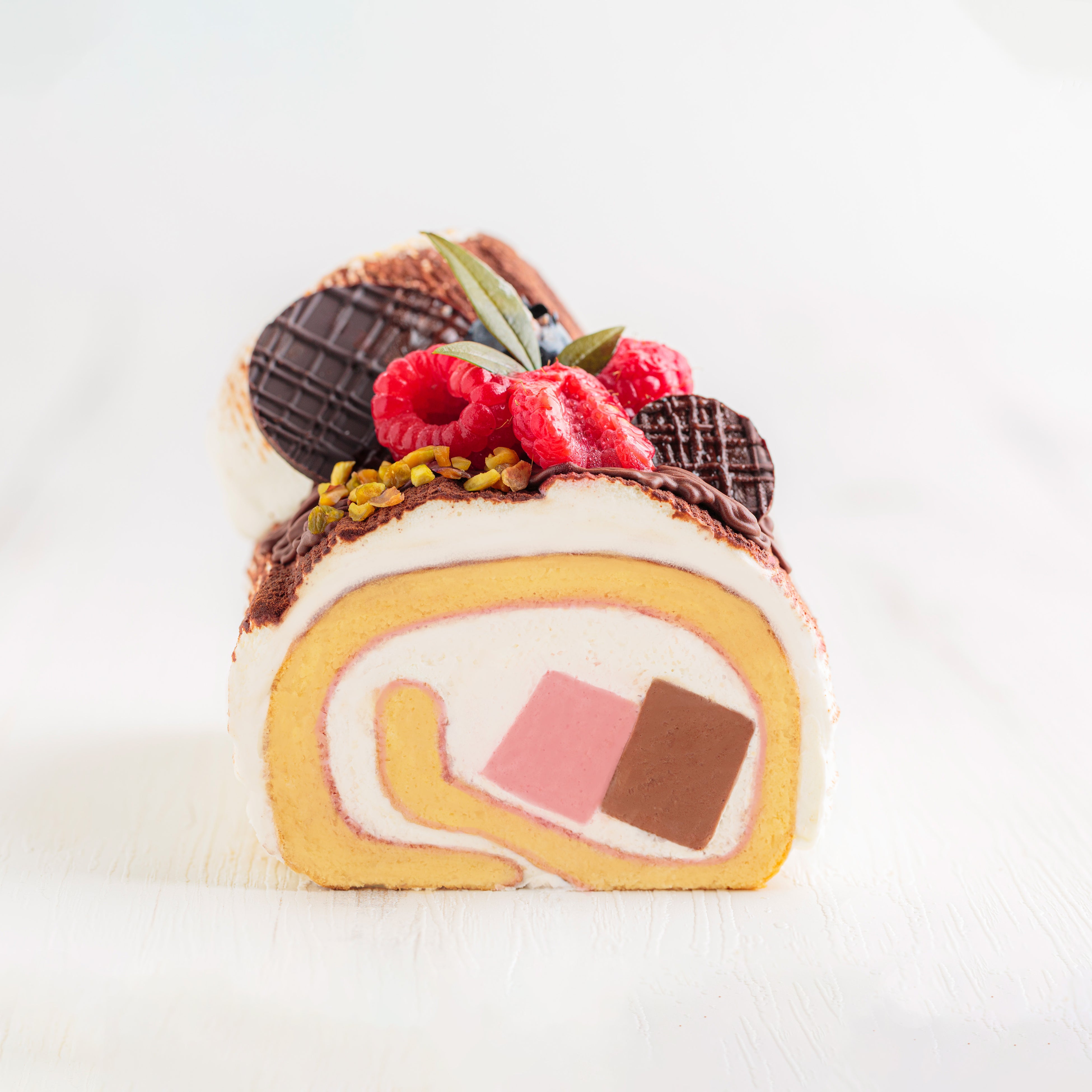 特製ラズベリーソースでフルーティー感と酸味を加え、たっぷりの生クリームとラズベリームース、チョコカスタードを一緒に巻き上げました。