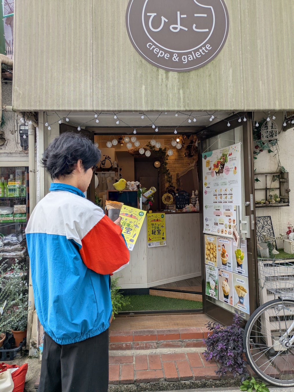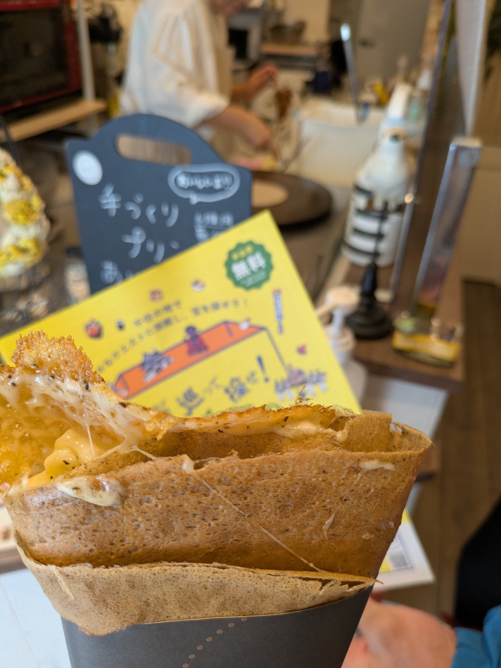 ひよこcrepe & galette(捜索範囲MAP 46)では、あつあつ出来立てのチーズグラタンクレープをいただきます。冊子と一緒に撮影して報告し、クエストクリア!