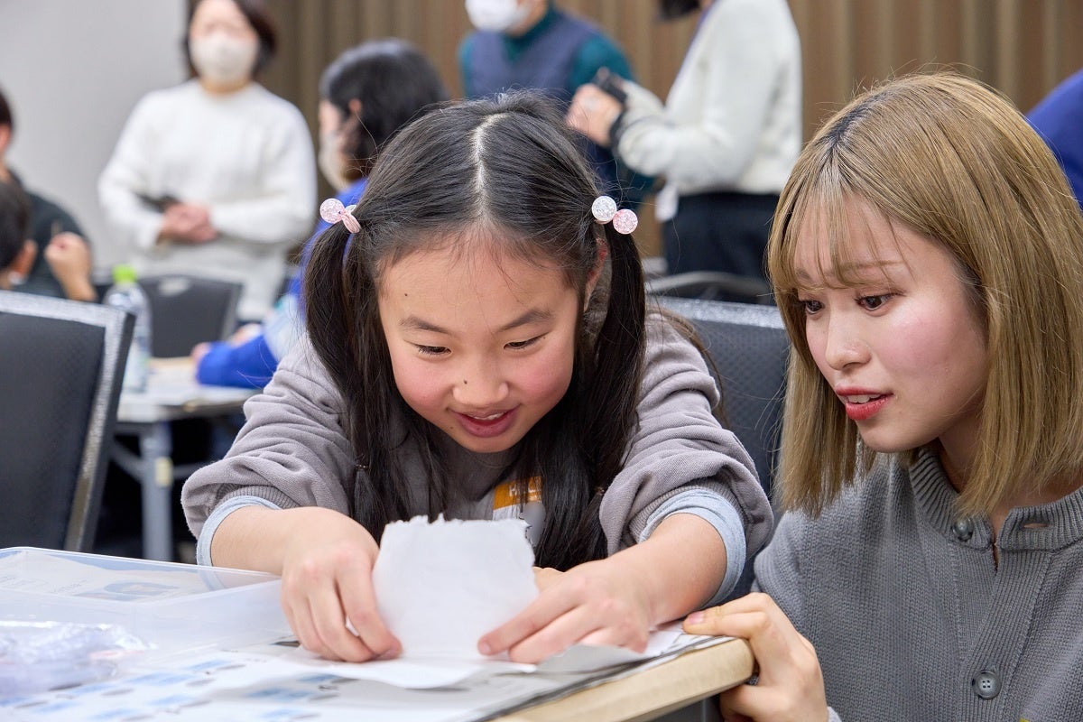 参加した小学生たちは武蔵野大学の学生にレクチャーを受けながら、このバナナペーパーの紙漉きを実践しました。