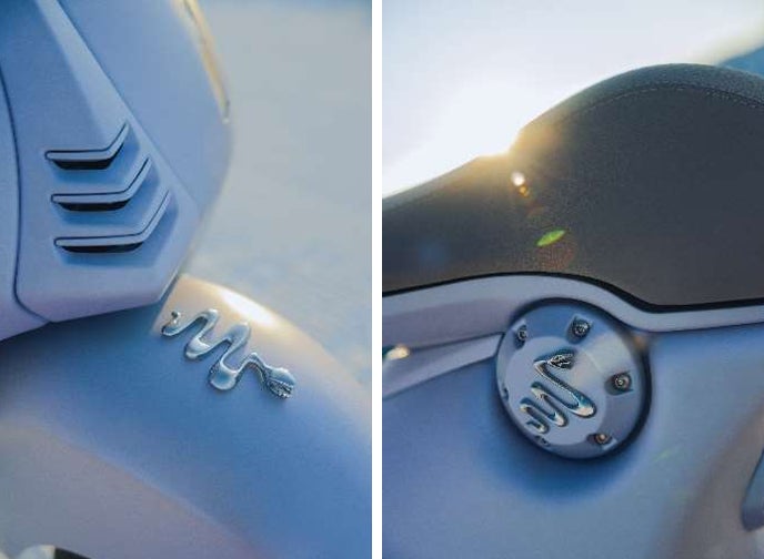 この氷河の様な風景に蛇のインスピレーションが織り込まれています。ハンドルグリップとシートには、柔らかい 質感で蛇の鱗を再現した表皮を採用し、サイドのオーナメントカバーとフロントフェンダーの両方に施されたクロ ームメッキのスネークの立体エンブレムが、強さや優雅さ、そして独創性が融合したデザインを引き締めていま す。