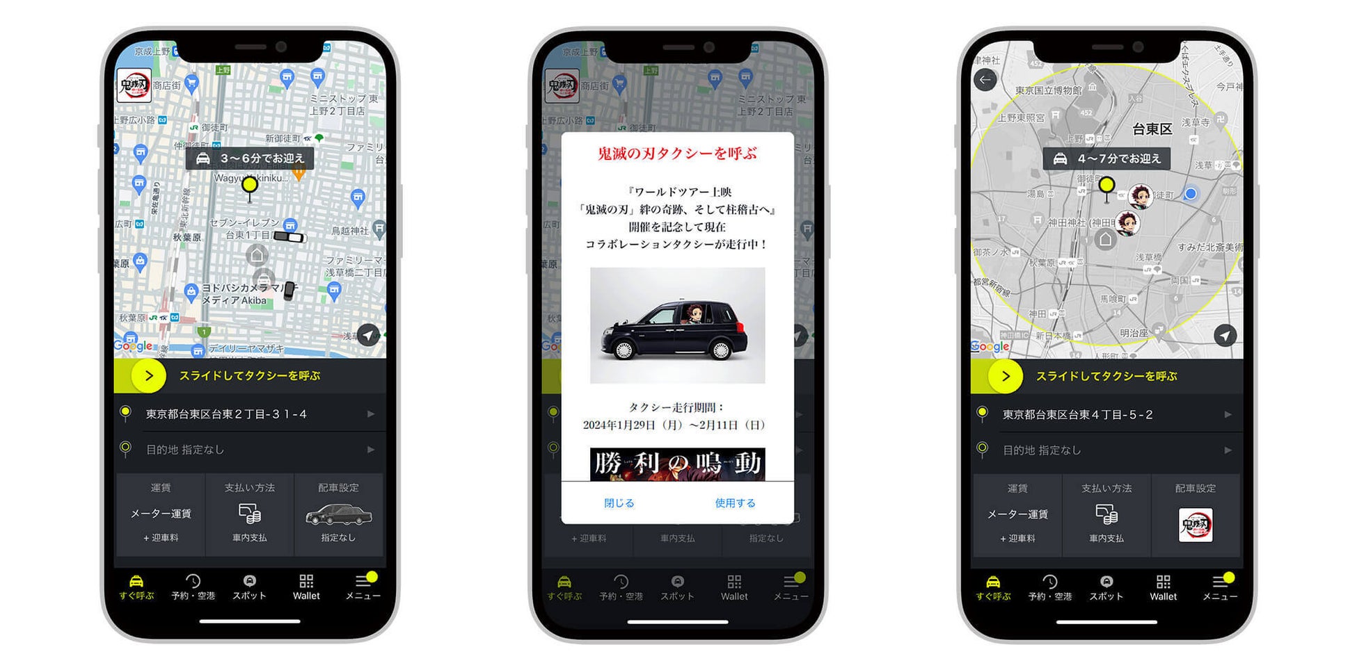 タクシーアプリ「S.RIDE」を起動し、画面左上に表示されている『ワールドツアー上映「鬼滅の刃」 絆の奇跡、そして柱稽古へ』のアイコンをタップし、「使用する」を選択することで配車可能。