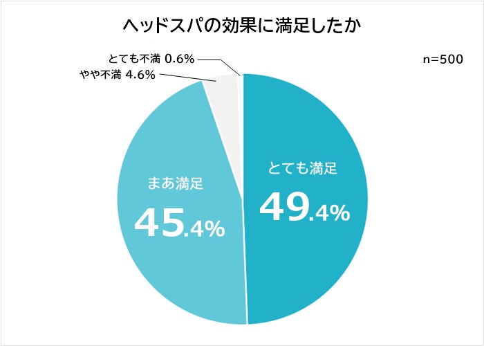 最後にヘッドスパの効果への満足度を聞いたところ、「とても満足」「まあ満足」と答えた人が合わせて94.8%。ヘッドスパに満足している人が圧倒的に多いとわかりました。