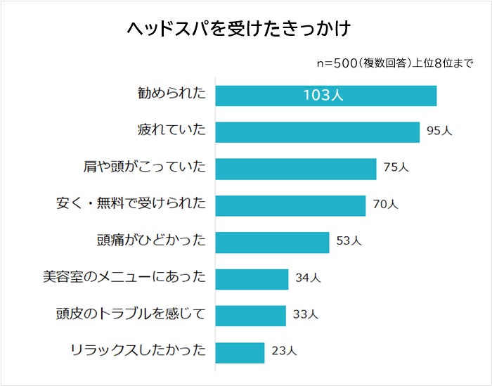 ヘッドスパを受けたことがある500人に受けたきっかけを聞いたところ、1位は「勧められた(103人)」でした。2位「疲れていた(95人)」、3位「肩や頭がこっていた(75人)」と続きます。