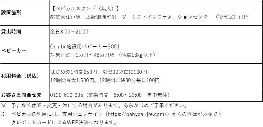 ◆今回、東京都交通局及びJREベビーカーシェアリング有限責任事業組合は連携のうえ、都営大江戸線上野御徒町駅構内でサービスを開始している「ベビカル」を東京都交通局が新たに開設する「こどもスマイルスポット」の設置サービスとして展開いたします。