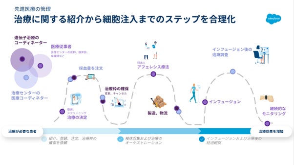 SalesforceのAdvanced Therapy Managementは、医療機関、製造委託先、物流業者、製薬会社の一連の業務をシームレスに統合し、単一のデジタルプラットフォーム上で、製薬会社が複雑なプロセスを管理し、個別化治療を患者さんに提供できるようにします。
