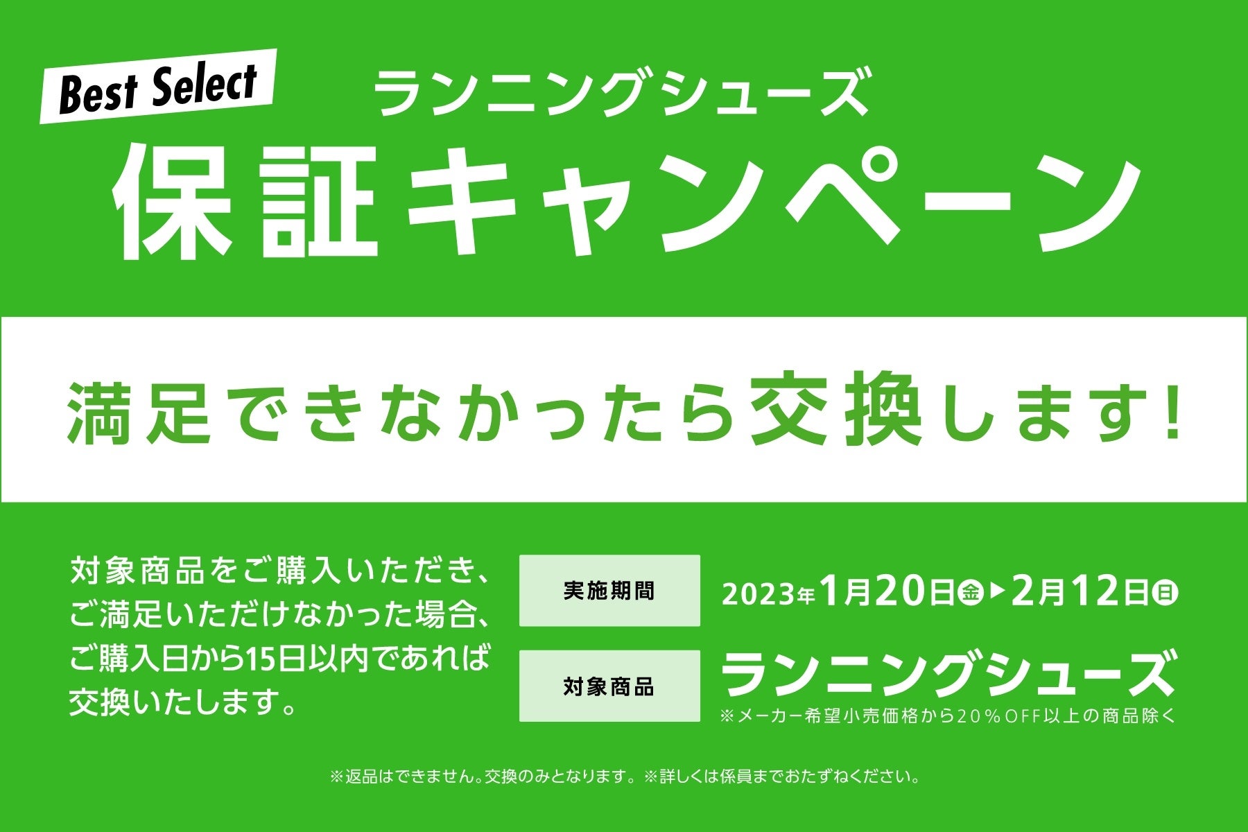 各社自信を持ってお勧めできるシューズだからこそ、もしご使用後に満足頂けない場合は商品交換が可能な「ランニングシューズ保証キャンペーン」を実施いたします。「みんな走ろう、歩こう。」キャンペーン期間中にご購入のシューズを対象に、購入後15日以内であれば使用後でも他の商品と交換させていただきますので、安心してランニングシューズをご購入いただけます。(※オンラインストアを除く)