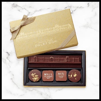 丸ビル開業20周年&新丸ビル開業15周年を記念した東京店限定セット。トリニダード・トバゴ産のカカオ豆を使用したスペシャリテ「パレ ド オール」に、東京駅舎をかたどった限定タブレットの組み合わせ。