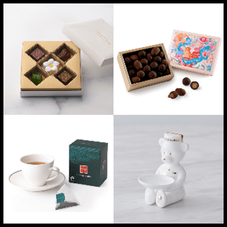 ザ・ペニンシュラ東京のシェフが監修したチョコレート詰め合わせ2種に加えて、ブレンドティー、お菓子やアクセサリーを置けるベアホルダーが入った、丸ビル20周年のための豪華セット。(数量限定)