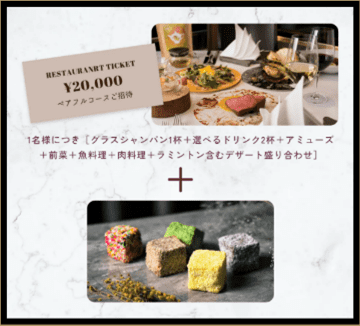 モダンなオーストラリア料理のフルコースを堪能できるペアチケットと、地元の伝統菓子ラミントンをセットでご用意。大自然が育てた新鮮な食材をじっくりと味わう贅沢な時間を大切な人と楽しんで。(数量限定)
