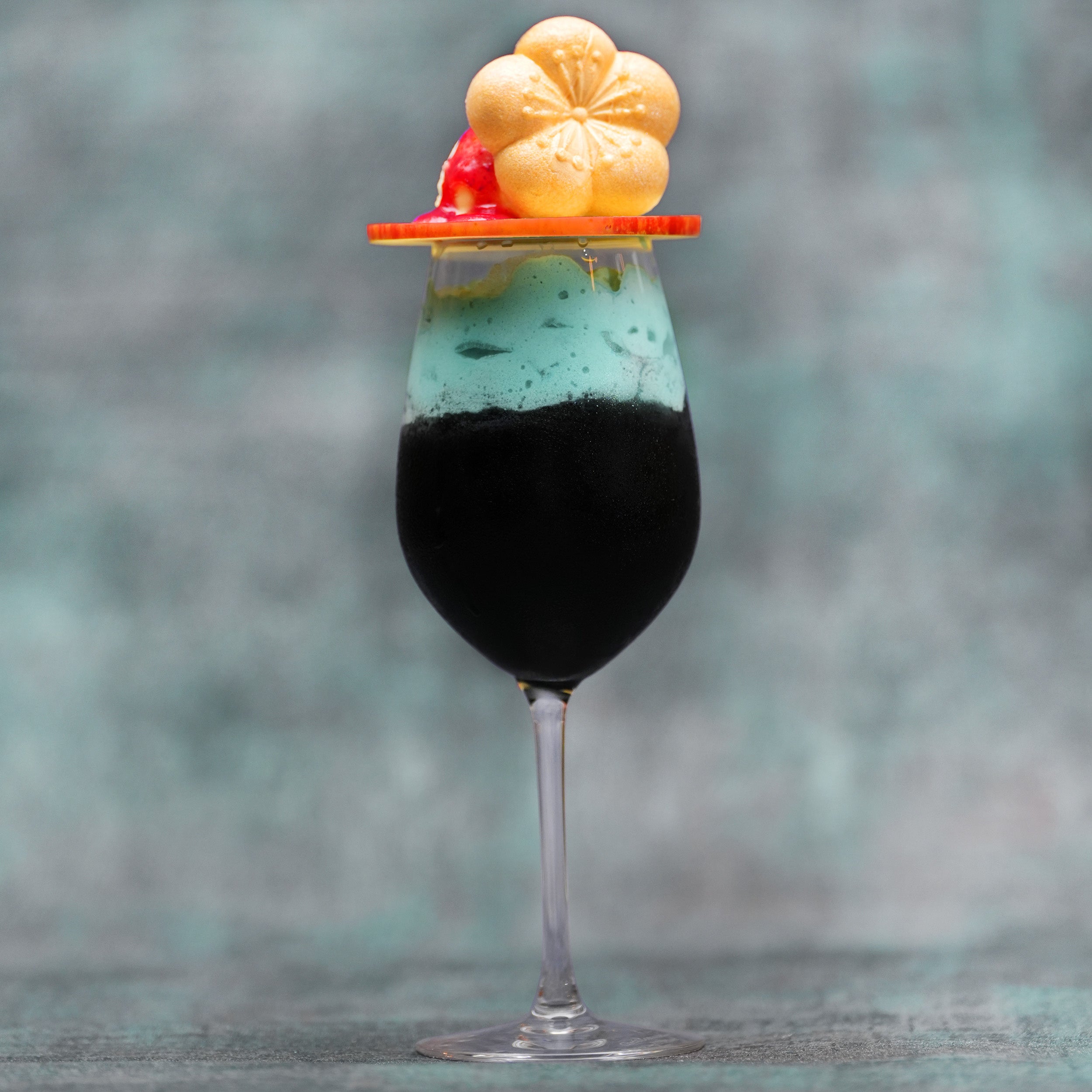 UME ECLIPSEは、フローズン完熟梅を1粒入れたグラスに梅シロップとブドウジュースと竹炭パウダーをブレンドしソニックに仕上げ、チョコミントエスプーマを浮かべ、リンゴスライス、バニラアイス、梅と紫芋シロップ、梅最中を乗せました。暗闇の中に潜む完熟梅をクラッシュしながらしっかりとした酸味のある味わいをお楽しみください。