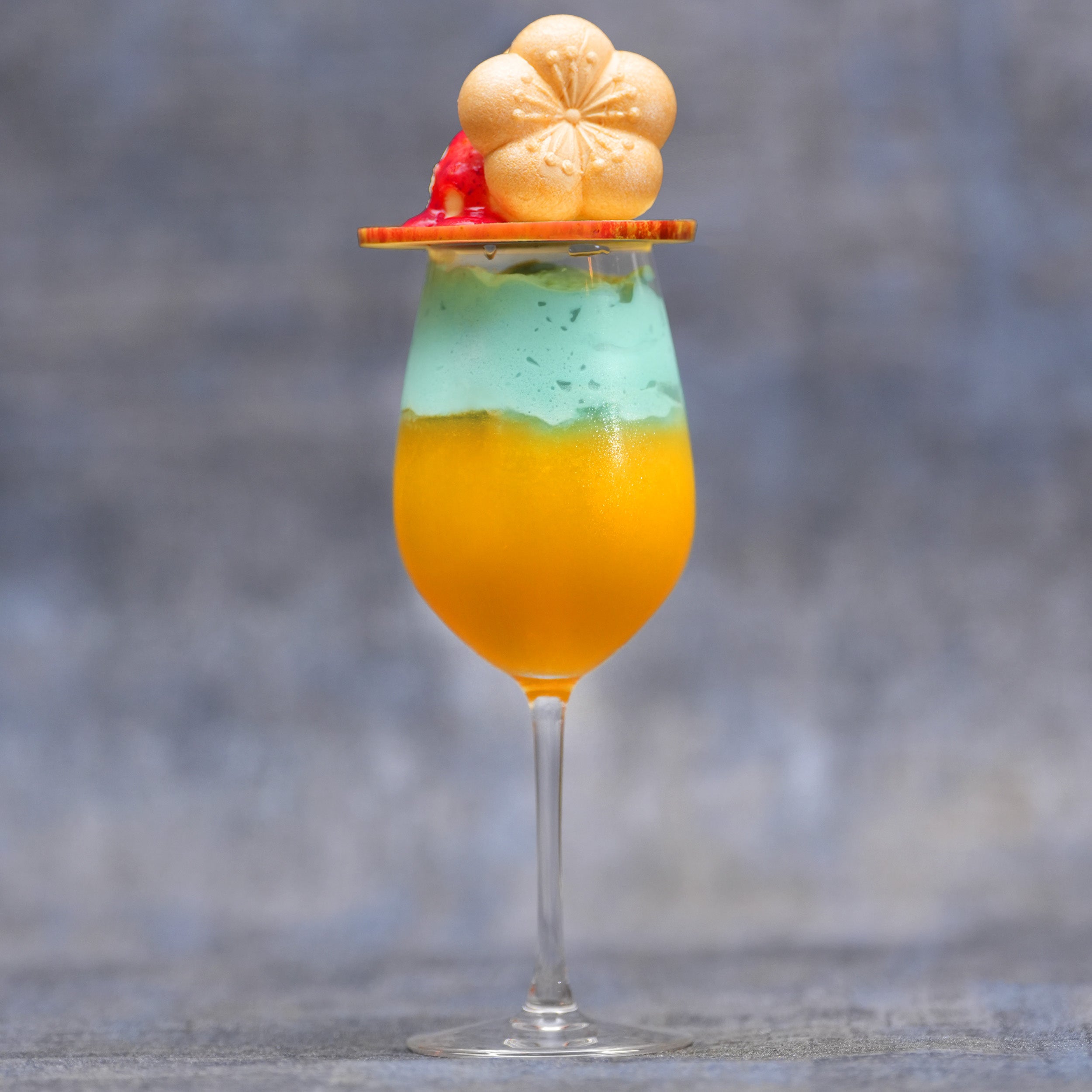 SWEET HARVESTは、完熟梅とサツマイモのシロップにオレンジジュースをブレンドしソーダとトニックで割り、抹茶とチョコレートとヨーグルトにミントを使用したチョコミントエスプーマを浮かべ、リンゴスライスで蓋をしバニラアイス、梅最中を乗せました。バニラアイスには紫芋と梅を合わせた特製シロップをかけました。スイートな口当たりとチョコミントの爽やかな味わいの調和が取れたカクテルです。
