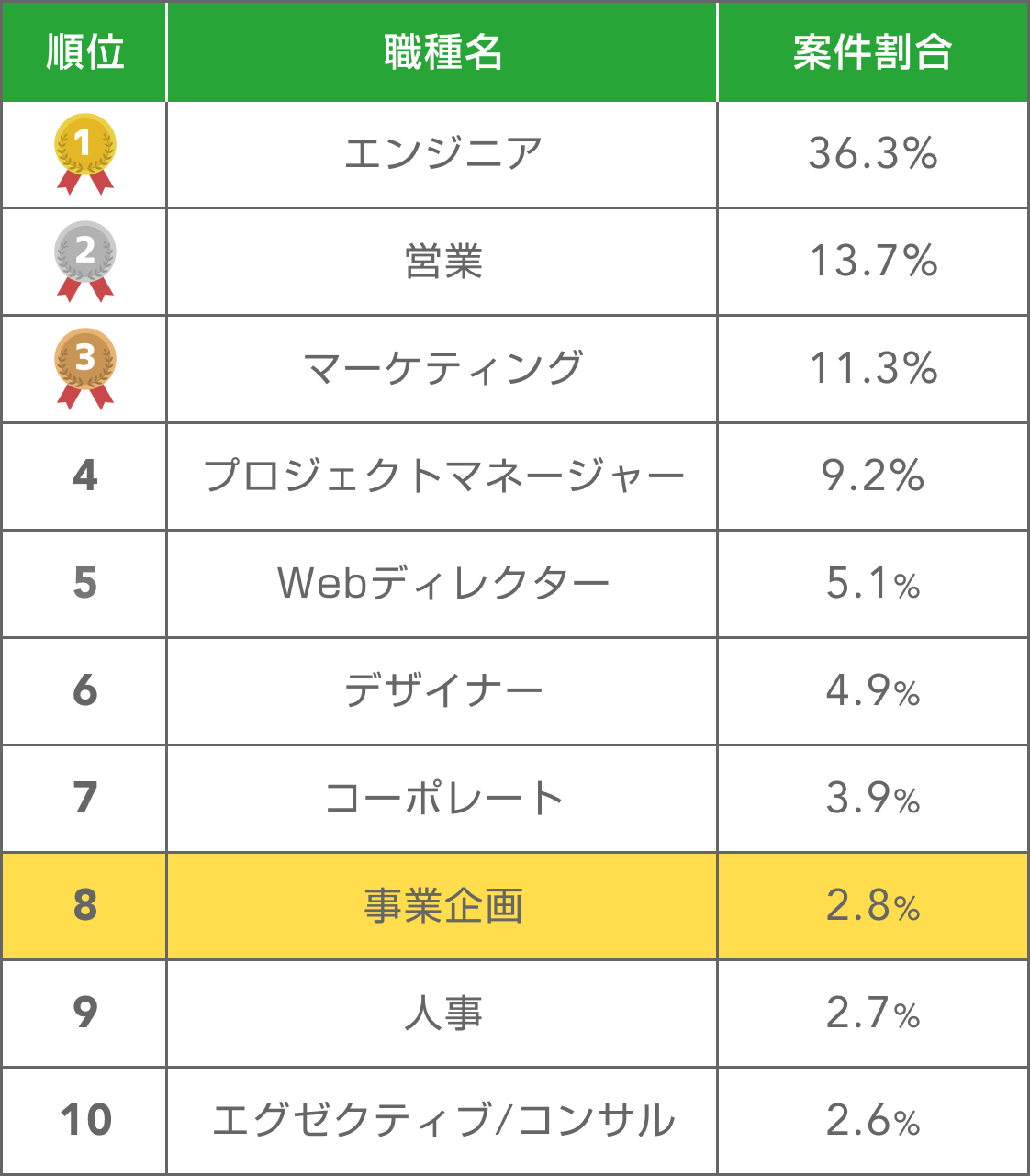 事業企画案件は職種別案件数ランキングで8位、全体の2.8%と比率は控えめです。高年収にもかかわらず案件数が少ないのは、経営に近い戦略的なポジションで、企業ごとに限られた人数しか配置されないためです。新規事業の立案や事業戦略の策定といった高度な専門性が求められる一方、そのポジション自体が希少価値を持っています。案件数は少ないものの、一度獲得できれば高収入と大きな裁量権を得られる、質の高い職種といえます。