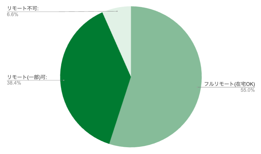 フルリモートが55.0%と過半数を占め、リモート一部可を合わせると93.4%がリモート対応可能です。事業戦略の立案や市場分析、事業計画の作成など、オンラインツールで完結できる業務が中心となっているためです。ただし、経営層との重要な意思決定ミーティングや、事業部との綿密な調整が必要な場面では対面が求められることもあり、リモート一部可の割合も高めです。リモート不可は6.6%と非常に少なく、全国どこからでも高度な戦略業務に携われる環境が整っています。