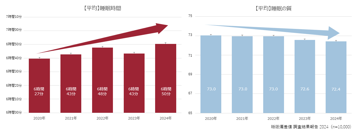 2024年の有職者1万人を対象とした「睡眠偏差値調査2024(以下「本調査」)」において、日本における平均睡眠時間は6時間50分と、過去5年の調査において最も長い時間となり、調査開始時の2020年と比較すると23分睡眠時間は増加しています。しかし、依然としてOECD加盟国の平均睡眠時間である8時間28分と比較すると著しく短く、日本の睡眠は世界でも最低水準であると言えます。