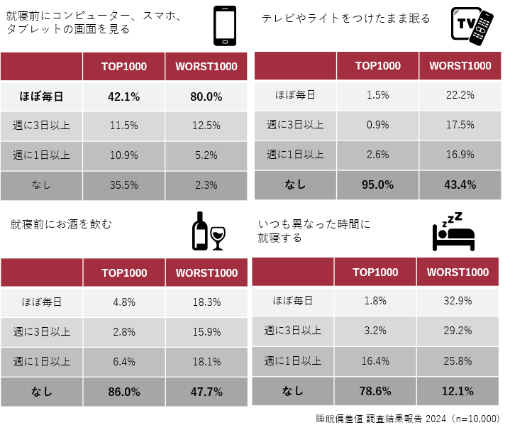 次に寝る前の習慣に関する調査では、睡眠の質が高い群と低い群で比較した結果、睡眠の質が高い群では睡眠の質を阻害する習慣を実施する頻度が少ないことが明らかとなりました。