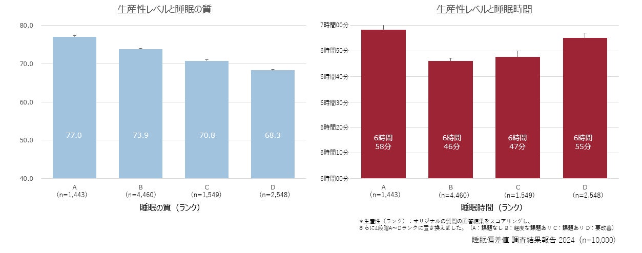 本調査では、睡眠の質は生産性と相関が見られ、睡眠の質が高い人は生産性が高い傾向にありました。一方、睡眠時間には生産性との明確な相関は認められませんでした。