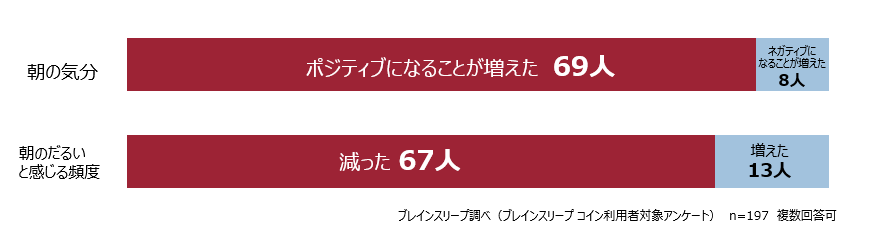 さらに今回の調査ではブレインスリープ コインを利用し始めてからの変化についてユーザーにヒアリングを行いました。その結果、多くのユーザーがブレインスリープ コインでの計測を始めてから朝の気分がプラスになったことがわかりました。