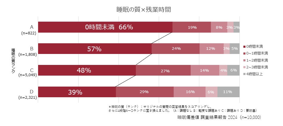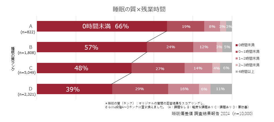 本調査では睡眠と残業時間に関して調査をしたところ、睡眠の質が高いAランク群は残業時間0時間未満の割合が66%と高く、ランクが下がるほどその割合が低下することがわかりました。残業時間と睡眠の質には相関があることがわかります。
