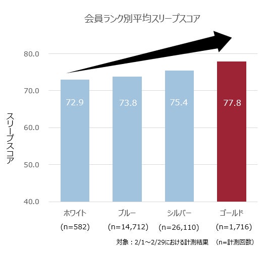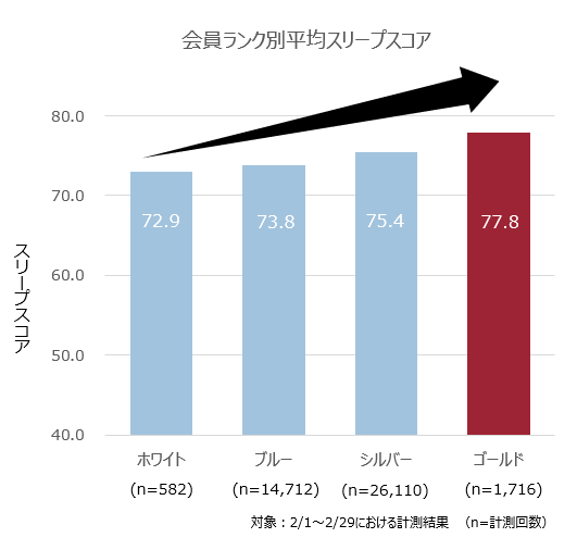ブレインスリープでは睡眠を計測するウェアラブルデバイス「ブレインスリープ コイン」を2022年10月より一般販売しております。ブレインスリープ コインは睡眠を計測するたびに「スリープ コイン」が貯まり、会員ランクが上がります。そこで会員ランク毎の睡眠スコア「スリープ スコア」を比較した結果、会員ランクが高い(計測回数が多い)ほど、スリープ スコアが高いことがわかりました。