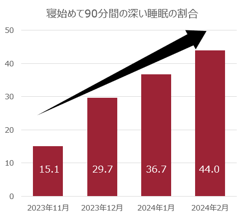また、今回アンケート調査にご協力いただいた方でご自身でも睡眠の質の改善を実感されている方のスリープ スコアの変化を見てみると計測を続けることで次第に睡眠の質に重要な寝始めの90分の深い睡眠の割合が増加していました。