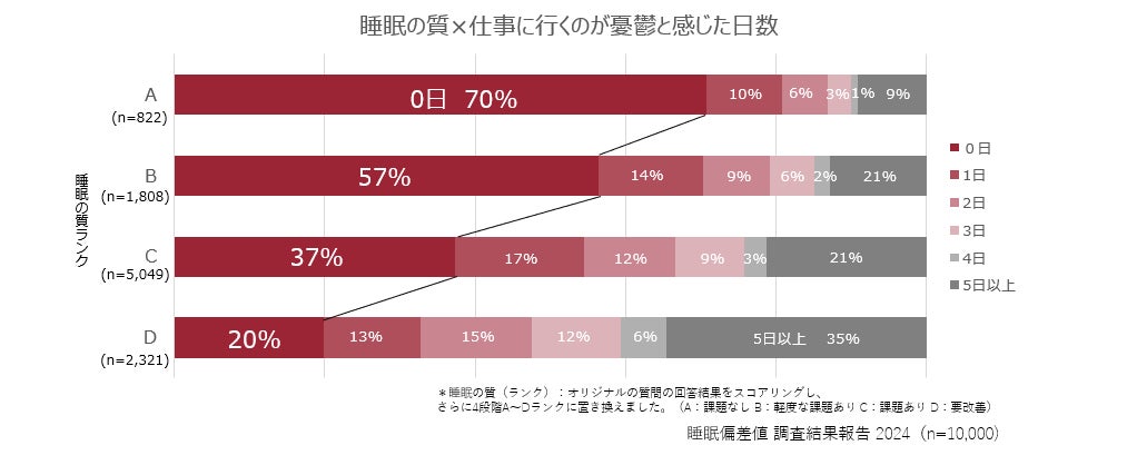 さらに「仕事に行くのが憂鬱と感じた日数」に関する設問では、睡眠の質が低いDランク群は仕事が憂鬱と感じている日数が長く、週5日以上と回答した方は35%、それに対して睡眠の質が高いAランク群は70%の方が週0日という回答でした。