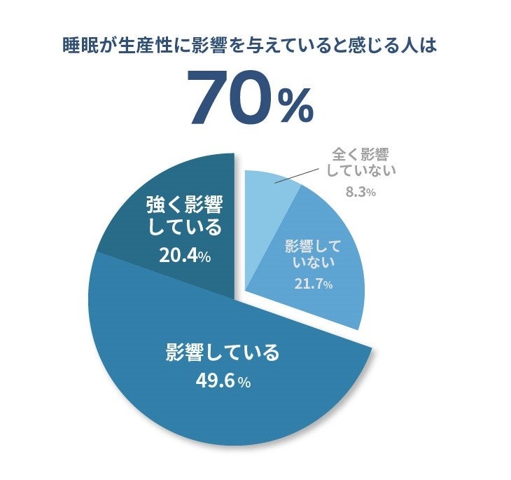 本調査において、睡眠が生産性に影響を与えていると感じているかの設問に「強く影響している」と回答した人は20.4%、「影響している」と回答した人は49.6%と全体の70%の方が睡眠と生産性の関連性を感じていました。