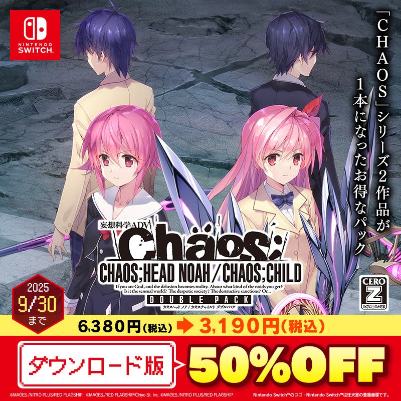 本編の『CHAOS;HEAD NOAH』と『CHAOS;CHILD』は、同じくダブルパックとなっており、Nintendo Switch™用として発売中で、CERO「Z」(18才以上のみ対象)に区分されています。現在本作は、ニンテンドーeショップにて9月30日まで期間限定セールを実施中です。