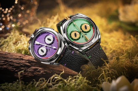 ダイヤルはバイオレットまたはフォレストグリーンのグレイン仕上げ
