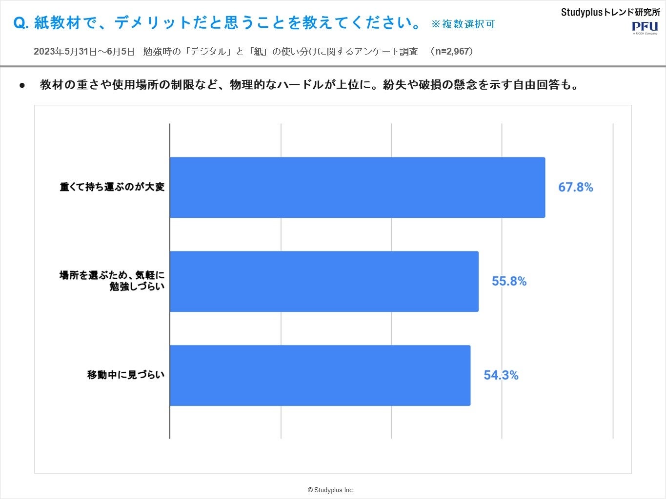 ・デメリットとしては、教材の重さや使用場所の制限など、物理的なハードルが上位に。紛失や破損の懸念を示す自由回答も。