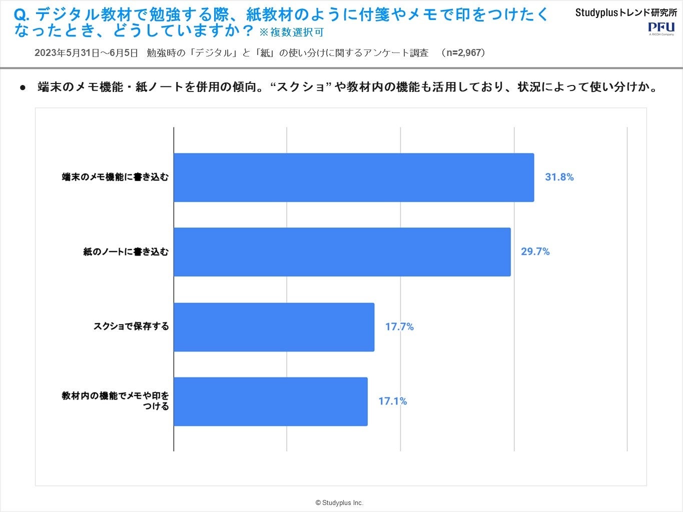 ・デジタル教材で勉強する際、紙教材のように付箋やメモで印をつけたくなったとき、どうしていますか? ※複数選択可