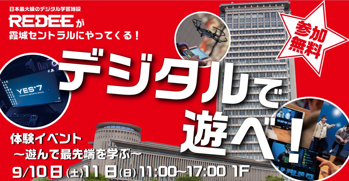 日本最大級のデジタル教育施設「REDEE(レディー)」(所在地:大阪府吹田市、運営:レッドホースコーポレーション株式会社)は、山形駅前のランドマーク「霞城セントラル」で同管理組合主催のデジタル学習イベントの企画・運営を現地のeSports施設「YAMAGATA ESPORTS SPACE YES*7」、株式会社サム・コミュニケーションズ(所在地:山形県山形市)とともに行い、9月10日(土)11日(日)の2日間に渡って開催することとなりました。