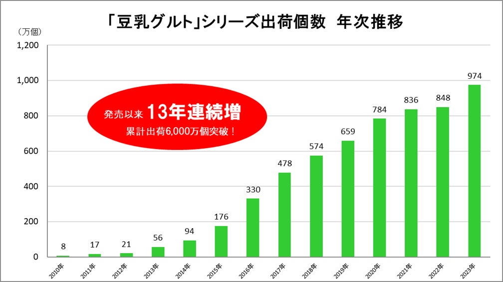 「豆乳グルト」シリーズは2010年4月の発売以来、多くのお客さまにご愛顧いただき、2024年7月現在でシリーズ累計出荷6,000万個を突破いたしました。