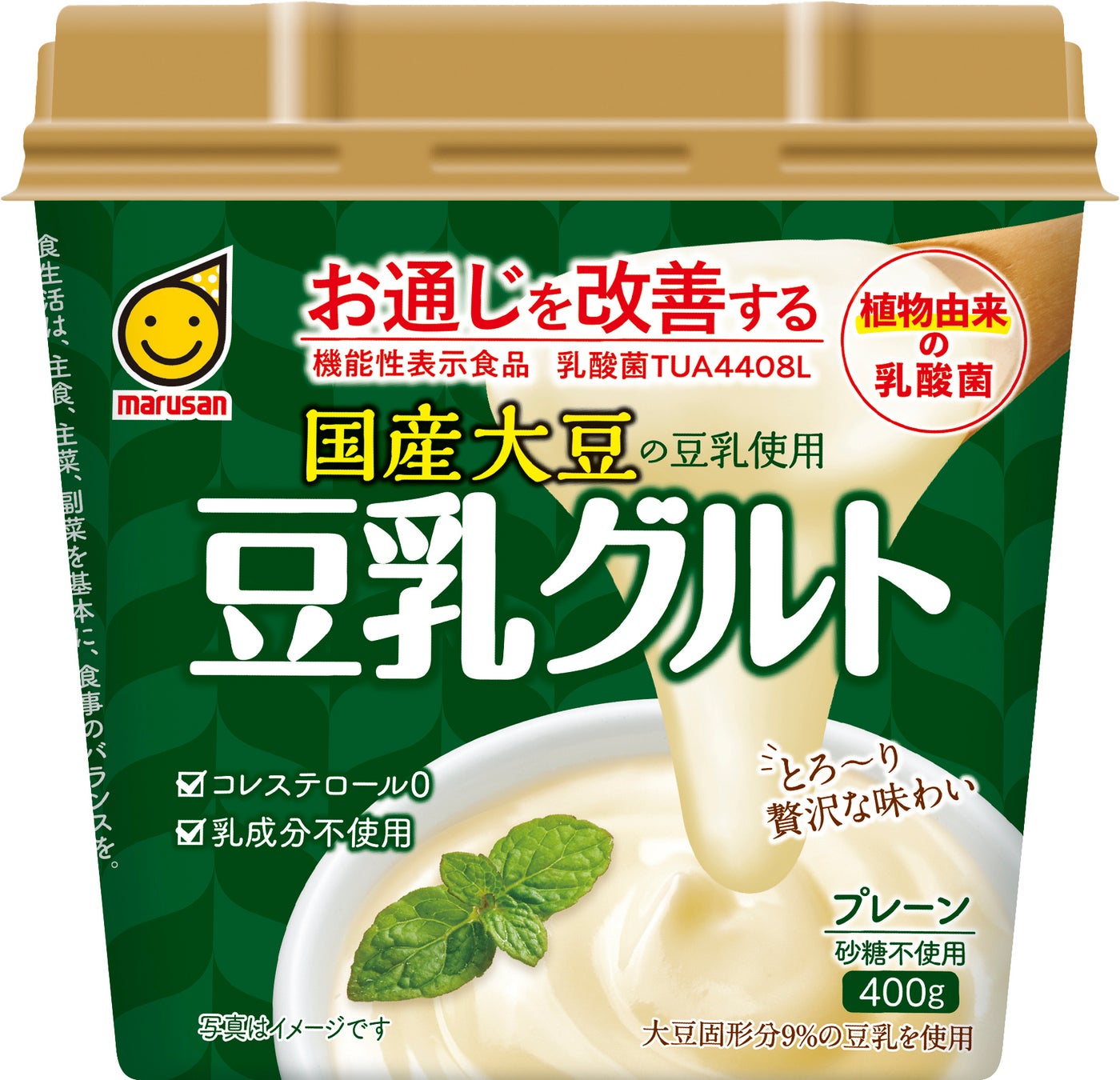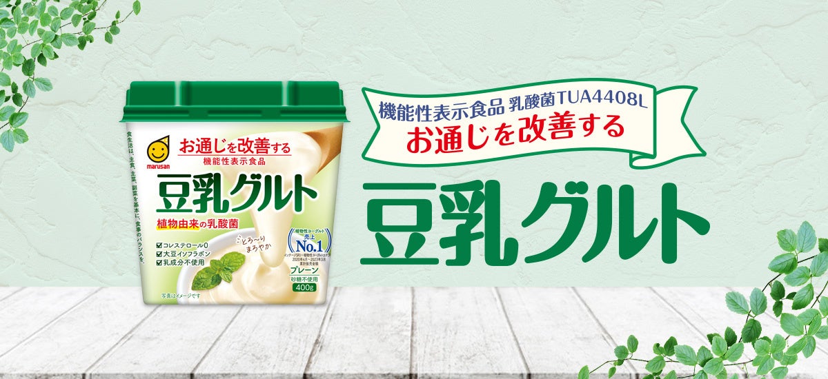 「国産大豆の豆乳使用 豆乳グルト400g」は、大豆固形分9%の濃厚タイプで、まろやかな味わいがお楽しみいただ ける豆乳ヨーグルトとして大変ご好評いただいております。本品に使用している植物由来の「乳酸菌TUA4408L」には “お通じを改善する”機能があることが報告されており、機能性表示食品として消費者庁に届出を行い、受理されたことから、おいしさはそのままにリニューアル発売いたします。なお、シリーズ品「豆乳グルト 400g」は、2022年3月より “お通じを改善する”機能性表示食品として販売しており、この度の「国産大豆の豆乳使用 豆乳グルト400g」リニュー アルに伴い「豆乳グルト」シリーズの現行ラインナップ2品ともに機能性表示食品になりました。