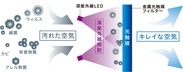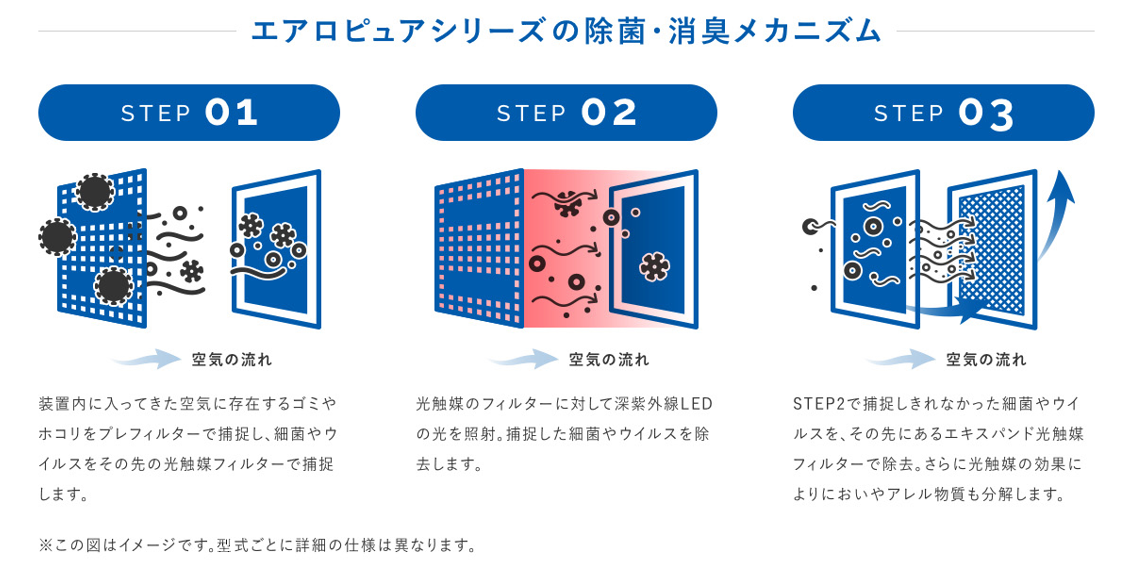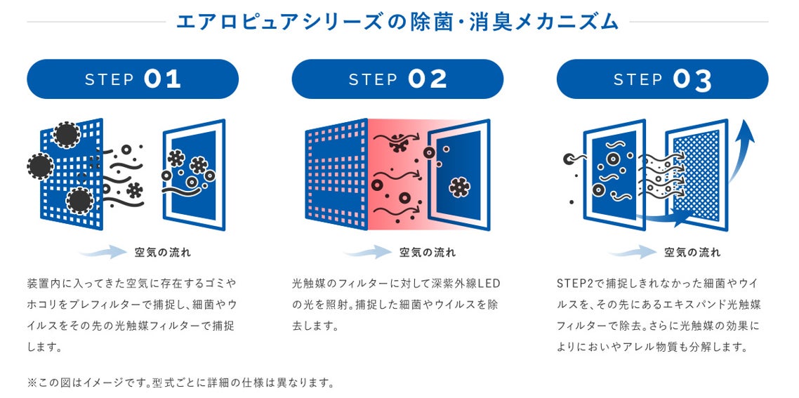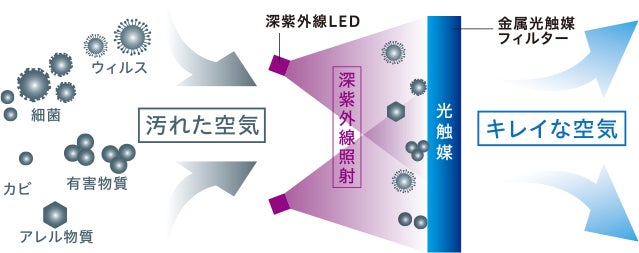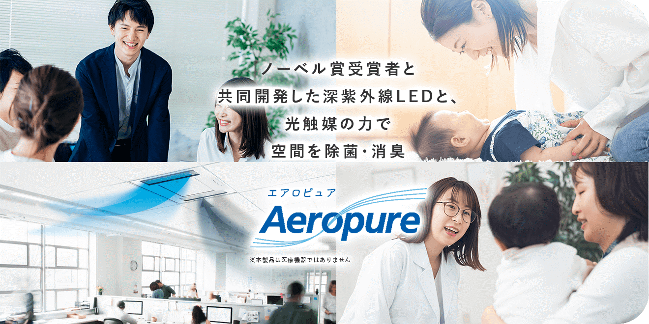 「Aeropure」は、日機装が2014年のノーベル物理学賞受賞者とともに開発した深紫外線LED技術を活用した、菌やウイルス、においなどを低減し空間の除菌消臭に特化した装置です。取り込んだ空気に深紫外線LEDを照射し排出する循環型の構造で、除菌効果のある物質を排出することはありません。また、深紫外線LEDは装置内に組み込まれており、直接人体に照射されることはありません。