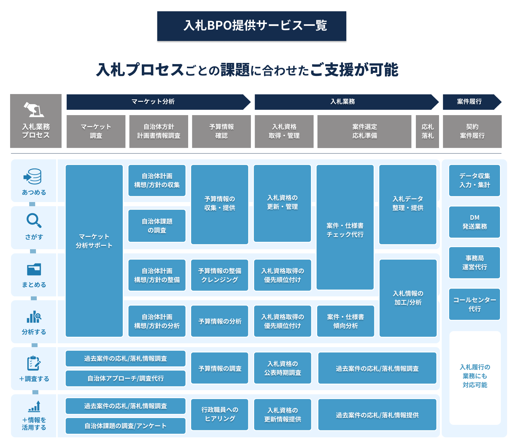 「入札BPO」が提供するサービスメニューは、【1. 入札公示前における「マーケット分析」】、【2. 応札に必要な「入札業務」】、【3. 落札後の「案件履行」】と大きく3つに分けており、企業において多岐にわたる入札プロセスごとの業務における課題やニーズに合わせてサポートいたします。