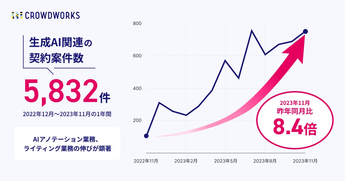 2022年12月から2023年11月までの1年間にわたり、生成AI関連の契約案件数は、合計5,832件となりました。また、2023年11月の契約案件数を昨年同月と比較すると8.4倍となりました。